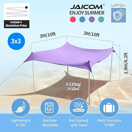 - Sun Screen Fabric: Our beach sun shelter are made of high quality stretch Lycra with UPF 50+ which blocks up to 98% of harmful UV rays, reducing glare and sunburn for healthier skin. You can clearly feel cooler shade with the JAICOM Beach sun shade