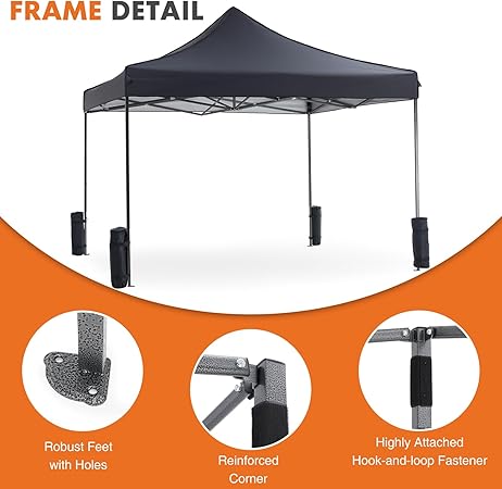 - 【Easy Set up】Our pop up canopy tents come pre assembled, require no tools and can be set up quickly by one or two people. Simply unfold the frame, cover with the top cloth and adjust the height for instant shade in a short time.