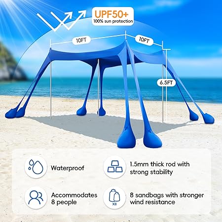 - Large Size Beach Canopy: Extra large family beach canopy tent is 10×10 feet tall, held up by 6.5 feet tall collapsible thickened anti-bending and rust-proof aluminum poles to keep the entire awning area at full height, expanding the shaded area to comfortably accommodate 6-8 people, beach tent not only suitable for couples, families, or a small get-together with friends in the backyard but also suitable for various outdoor scenarios, such as beach parties, fishing,picnics or camping.