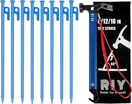 - 【Buy with Confidence】Include 12” 8pcs blue tent stakes and 12″ carbon steel aluminum camping hammer blue. Any issues about RIY stakes, please feel free to contact us, we will give you a satisfactory answer within 24H.