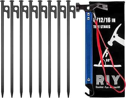 - 【Buy with Confidence】Include 12” 8pcs tent stakes and 12″ carbon steel aluminum camping hammer blue. Any issues about RIY stakes, please feel free to contact us, we will give you a satisfactory answer within 24H.