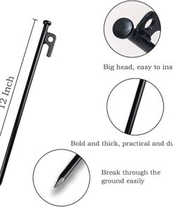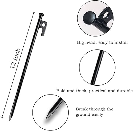 - Package – included 12 pieces 12 inch heavy duty steel tent stakes with hole, each measuring 12 inch in lenght, 0.36 lb in weight. Value package to meet your daily outdoor or camping usage