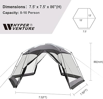 - Screen House Dimension: 15’ x 13’ x 86”. Usable Space: 195 square feet, providing a spacious interior shelter that comfortably fits 8-10 adults.