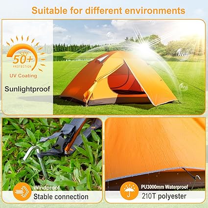 - All-round Waterproof Design: our tent is equipped with a specially developed seam tape structure, high-quality 210T polyester fibres and a 3000 mm thick hydrostatic polyurethane coating, which can effectively block rainwater. The base material of the camping tent is made of 210D Oxford fabric, and the double-layer design of the bottom seams can effectively prevent the floor from tearing and leaking