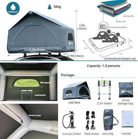 - Comfortable Sleeping – These rooftop tents come with comfortable inflatable mattresses that provide a cozy and supportive sleeping environment. Tent Size: 220x145x140cm/86.6″L x 57.1’W x 57.08’H