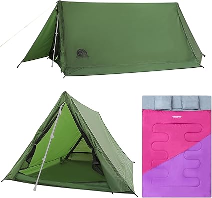 - FABULOUS DESIGN: This A-frame tent has two A-frame double-layer doors of net and fabric for better ventilation and no condensation. It offers convenient entry/exit for backpackers and two large vestibules for storing gear. Sufficient for 2 people. The two-person sleeping bag can be separated into two. Layers can be used as quilt/blanket. In summer, unzip bottom for air circulation. Smart design for hot/cold weather. Top Velcros prevent zipper sliding