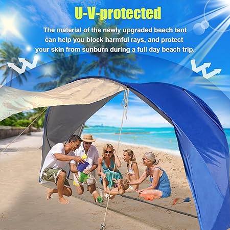 - SPACIOUS AND COMFORTABLE: The beach tent is arch-shaped and can easily accommodate 4-6 people.The beach sun shade canopy suitable for family outings or friends’ gatherings, providing plenty of shaded space for everyone to enjoy a comfortable beach time. In addition, you can choose to sit and rest directly under the beach sunshade or relax by setting up camping stools