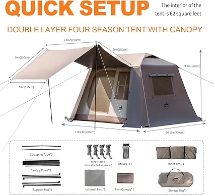 - 【Spacious】Tent inside area is 62 feet, suitable for four-person family outing, with vestibule design, increasing the outside space for activities.