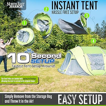 - [ EASY SETUP ] Instant Pitch Tent with Pre-Assembled Integrated Poles Makes the Pitching Process a Breeze! Simply Remove from the Storage Bag and Throw it in the Air! If You are Traveling Solo, Then This is the Easiest and Most Convenient Tent on the Market. 4 Person Instant Tent Takes Mere Seconds to Pitch which Gives You a Lot More Time to Enjoy All of Your Outdoor Activities!