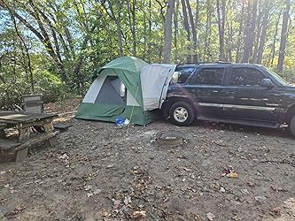 We purchased this for Rock Fest and loved it. It was super nice to be able to open one side of the tent and have all of our food and stuff right in the back of the vehicle without having to get out of the tent constantly. There was plenty of room for a queen sized air mattress and our bags inside.