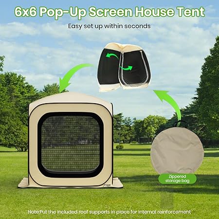 - 𝗣𝗼𝗿𝘁𝗮𝗯𝗹𝗲 𝗮𝗻𝗱 𝗘𝗮𝘀𝘆 𝗦𝗲𝘁 𝗨𝗽: Boast its pop-up design that a single person can set up within a minute;Just take it out of the storage bag and pop it open,finally put the included roof supports in place for internal reinforcement and you’re done.Folds up flat and comes tucked into a zippered bag with handles when not in use for moved anywhere at any time