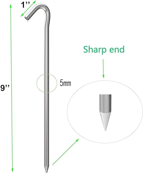 - Size:Galvanized inflatable stakes are 9″ length with 1″ hook for attaching rope or for anchoring, perfect tent pegs, tarp hooks,tent hooks,tent spikes