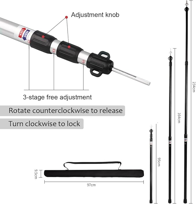 - 【Telescopic Height Adjustment Feature】 These awning poles are telescopic in design, allowing you to effortlessly adjust their height within the range of 35.4″ to 90.6″ (approximately 0.9m to 2.3m). It’s really convenient for you to customize the height according to your specific needs.