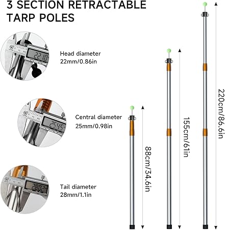 - Strong and Durable Tarp Poles: KOMCLUB tarp poles is made of high quality stainless steel tube, which is strong and durable, super anti-corrosion and anti-rust. Compared with aluminum alloy, stainless steel tarp poles can last longer! Perfect for supporting awnings, tarps, camping tarps, canopies, etc. It is a must-have camping accessory for all outdoor sports enthusiasts.