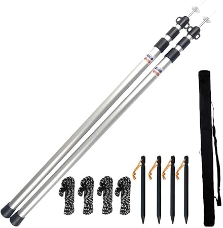 - Strong & Lightweight Tarp Pole Set for Large Tarps: The outer diameters of the three sections of each pole are 11.8 in (30 cm), 9.8 in (25cm) and 8.2 in (21cm). This adjustable tarp pole set is made of durable and lightweight aluminum 6061 alloy, suitable for pitching large tarps against unexpectedly heavy rains or winds. The 2-pole set comes with a carry bag and remains lightweight at 2.6 Pounds (1.2 kg)