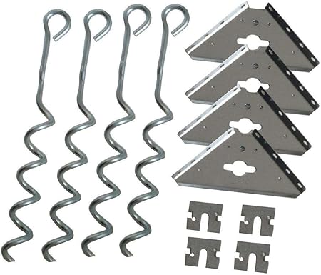 - Contains quantity 4 corkscrew type anchors, quantity 4 corner gussets, quantity 4 locking washers