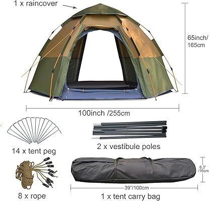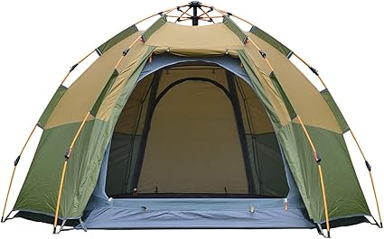 - FiberglassTent for camping, hiking, backpacking,tent.let us enjoy a relaxed and comfortable outdoor camping.?Large space, can sleep 3-4 person.?Good waterproof fabric, have raincover in it.?2 large door, well ventilation.?Durable 6 tent poles, can use at windy day.?Package with carry bag, good for family camping.You could carry the bag in your backpack or store it in the car easily.Ideal for family car camping or camping site.