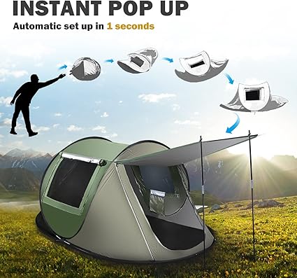 - Instant pop-up tent :This tent sets up in 1 seconds, simply opens the bag and lets go, it will automatically set up ,making the pitching process easy and enjoyable. No need to fumble with tent poles, or bother with instructions, easy to fold back into a compact