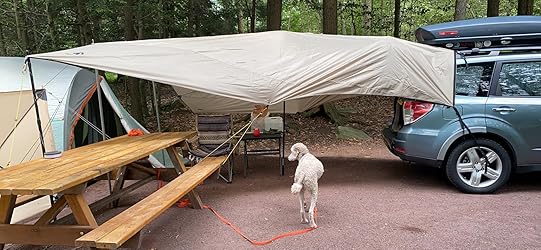 This is perfect for our camping needs. It a nice size to open up over our seating spot to help shade our area and protect it from any potential rain. It also helps to cover the grill/fire pit to keep water out so it stays dry for when you need it. No one likes to try and start a fire with wet wood…too smokey and hard to do. Now, this was only the tarps, so you will need to get the stakes/posts to pitch it up, but this does the job and seems like good quality.