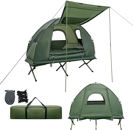 - 🏕️Versatile Camping Combo: Comes with a canopy, a camping cot, a sleeping bag, an air mattress and a air pillow (2 covers are included), this folding tent cot is cost-efficient and perfect for fishing, hiking, camping or any other outdoor activities. Note: Please use it in weather above 5℃ and without heavy rain or fog.