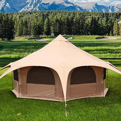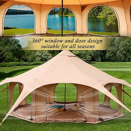 - 【4 Season Luxury Outdoor Camping】The top of the glamping tent is equipped with an adjustable vent with an included elastic cord to tighten and secure it, making it easy to regulate moisture and temperature inside the tent; 8 removable doors to feel the gentle breeze of nature. The coolest feature of our yurt tent is that the floor is removable, and the inner and outer tents are designed to accommodate a wide variety of camping needs.