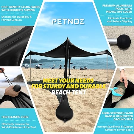 - 【 SAVE THE FRUSTRATION ON THE WINDY BEACH】 When you enjoy a relaxing beach trip, are you frustrated that the beach tent is messy in the wind? Here, PETNOZ beach canpoy can be set up within 20mph winds with no issues. It holds up well in the wind because of the extra big sand anchors and high quality rust-proof aluminum poles. Make sure to use the included rubber bands to fix the poles to the tent and fully fill the sandbags, or use the ground pegs to add extra stability.