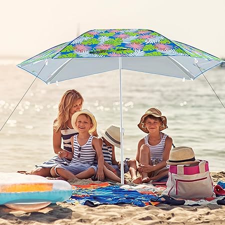- UPF 50+ Protection: Crafted from silver-coated polyester fabric, this beach shade canopy offers UPF 50+ protection from harmful UV rays. It’s water-resistant, durable, and provides over 98% protection.