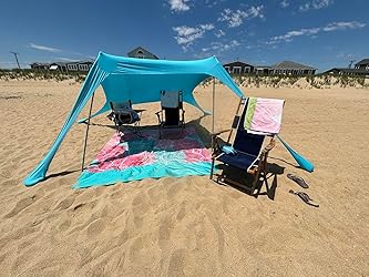 - 【Beach Vacation】The color of beach sun shade is same as the sky and the ocean, being in this beach tent makes you feel relaxed and happy. Enjoy relaxing on the beach, kicking back fishing on the side of the lake, or enjoying some family time at the park with a sun shelter that you can set up almost anywhere. It is not only suitable for beaches but also suited for various outdoor scenes such as fishing, park outings, camping, etc.