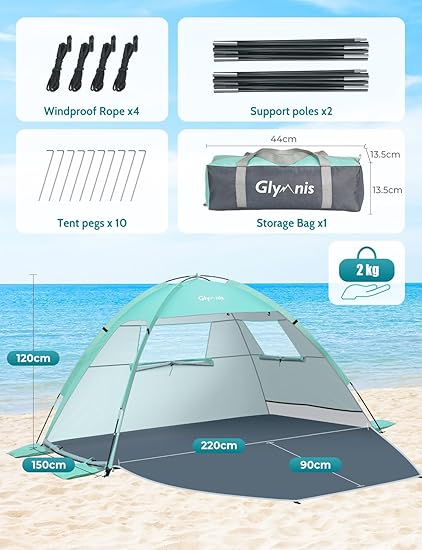 - Lightweight and Portable: The Glymnis beach shelter has a small storage volume, only 44×13.5×13.5 cm, and weighs 2 kg. It can be effortlessly packed into a backpack, suitcase or car trunk, saving space. With its handy carry bag, you can easily take it with you. It is your ideal companion for leisure and vacation