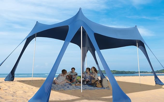 - 【UPF 50+ Lycra Fabric】The beach sun shelter is made of durable and elastic Lycra fabric. With full of elasticity, it can completely resist the pull caused by strong wind. The beach canopy can reduce more than 95% of harmful UV rays, protect skin from sunburn with a UPF 50+ UV protective coating. Outings in the summer will become a lot more pleasant and safer when you have our beach tent.