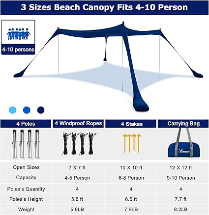 - PORTABLE BEACH GEAR: COMMOUDS sun tent for beach includes: 1x Beach Canopy Tent(10x10ft), 4x Ground Stakes, 4x Aluminum Poles, 4x Elastic Cords, 4x Windproof Ropes, 1x Sand Shovel, all in a waterproof portable bag, only 8lbs, which easily stored in your luggage and provides extra convenience for your outdoor travel.