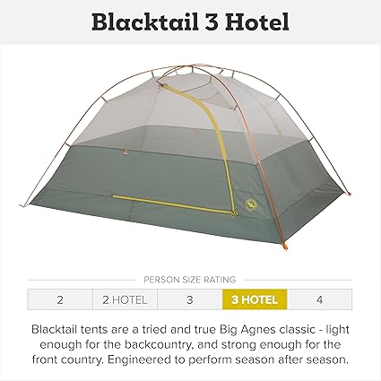 - Vestibule Options – Standard Blacktail models include two regular vestibules, while the Hotel version provides one extended, pole-supported vestibule and one quick-access vestibule, creating extra space for backpacking gear, pets, or sheltered cooking in these tents for camping