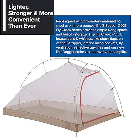 - TECHNICAL COMFORT – Our award-winning Fly Creek tents have been redesigned from the stakes up and are still your go-to, easy-to-setup shelter for ultralight adventures. NEW expanded headroom and larger front entry with updated high-volume architecture and steeper walls. Increased usable interior space without increasing weight using single-pole DAC Angle SF Hub, plus more usable volume added to the vestibule with vertical door construction.