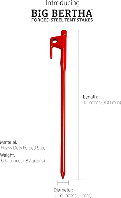 Secure your tent with confidence! Get Big Bertha Heavy Duty Forged Steel Stakes—12″ long, durable, and vibrant red. Perfect for camping adventures!