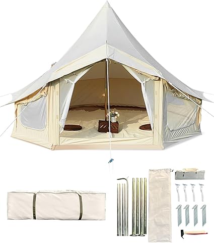 - Enhanced Durability and Breathability: Our Canvas Bell Tent, crafted with premium cotton, ensures exceptional durability and breathability, reducing condensation for a comfortable experience in any weather condition. The galvanized iron center and door poles provide sturdy support, enhancing stability and longevity.