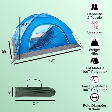 - DOME TENTS FOR 1-2 PERSONS: Easy assembly tent can be set up in just 10 minutes & comes with everything you need. Easy set up camp tent comes with 2 poles, 8 support stakes, rain dome flap, 4 pieces of 96” cord, convenient storage bag, & accessories pouch