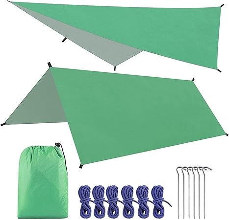- Multifunctional Design: This camping tent tarp serves multiple functions, including moisture-proof, waterproof, sunshade, and rainproof, making it perfect for camping, hiking, fishing, or as a floor mat for beach trips.Complete Set of Accessories: Includes all necessary accessories such as 6 aluminum floor nails, 6 wind ropes, and a storage bag for easy setup and transport.Durable & Waterproof Made from 210T waterproof polyester with a 1500mm waterproof coefficient and silver-