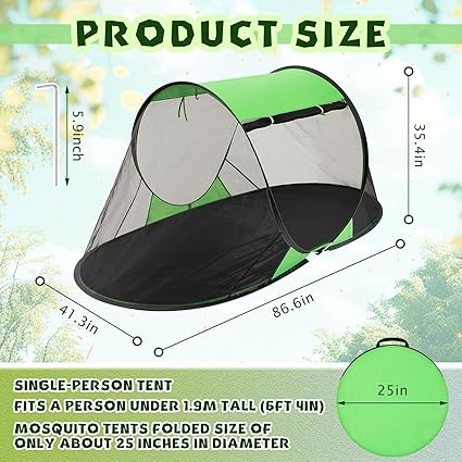 - the Compact Outdoor Journey: don’t underestimate our one person pop mosquito tents based on their folded size of only about 25 inches in diameter; Once expanded, they turn into a personal sanctuary of about 86.61 x 41.34 x 35.43 inches; A comfortable shelter suitable for one person, while also being portable and easy to carry around