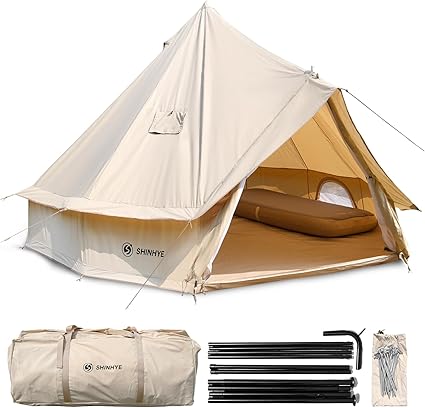 - 【4 Season Canvas Tent】– ShinHye canvas bell tent package includes a tent, stove jack, windows with mesh, roof vents, poles, a tool kit and a weatherproof bag – All are included with your purchase. The tent even has more space to put your camping table, camping chairs and other camping gears as you like