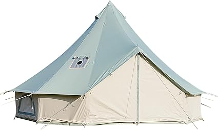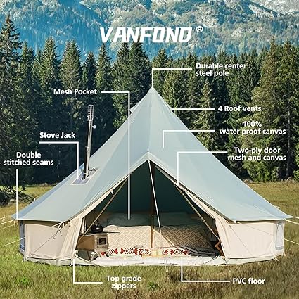 - ⛰️【Complete Package】Our yurt tent comes with a high-quality sewn-in PVC groundsheet, a 5” wide stove jack opening, standard mesh door, 4 windows and roof vents to increase air circulation, galvanized steel center pole and A-frame pole. Additionally, the canvas tent comes with a tool kit that includes stakes, pegs, a rain cap, and a rubber mallet.