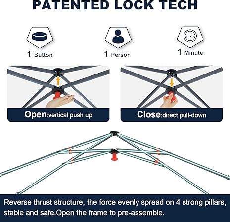 - 【Easy Setup on Seconds】This canopy tent enables 1 person set-up in 1 minute, which uses fully assembled One-Piece frame, no tools needed. Just open the frame, attach the fabric and adjust the legs height. Enjoy the shade quickly and easily under the sun.