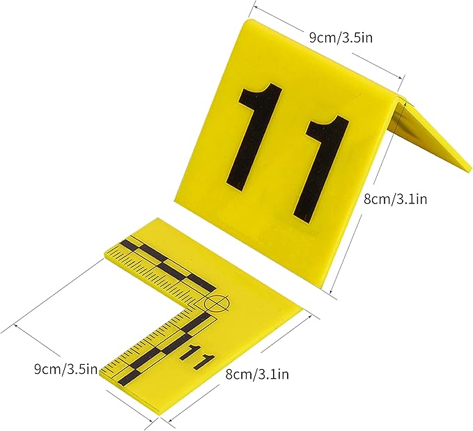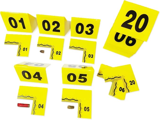 I let the high school drama teacher use these for her class and she was very pleased with not having to make them out of cardboard like she had in the past. The teacher said she saw how much evidence markers cost in law enforcement supply catalogs and was surprised how affordable these were. Along with some other props I have either made or purchased, I have made these available to the local high school drama department to use any time. They have the right color, shape and markings of genuine evidence markers, with the exception of not saying the marks are in inches or centimeters, which really isn’t important when used for their intended purpose.