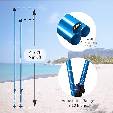 - UNIQUE ADJUSTABLE POLES:4 unique height adjustable aluminum poles can be adjusted according to the sun’s position to get more shade. Scale marking allows you to know the current height of the pole quickly. The shiny royal blue coat of the bar body sets you apart on the beach, and the quick-release structure makes height adjustment easier. The locking knob locks the label more tightly and prevents it from slipping off.
