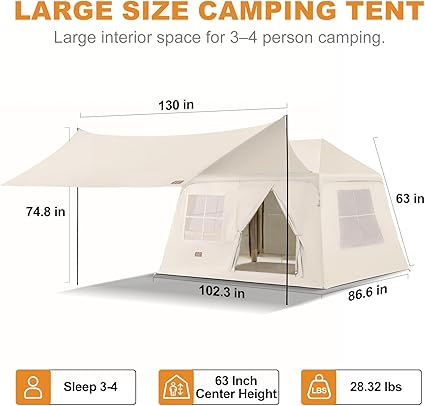 - 【SPACIOUS AND COMFORTABLE】:This pump up tent measures 102.4×86.6×63 inches when unfolded and can easily accommodate 3-4 people without feeling cramped. We also provide an easy-to-carry storage bag with storage dimensions of 28.7×12.6×12 inches and a weight of 27.5 pounds, designed for family camping.
