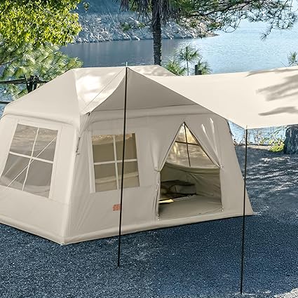 - 【EXCELLENT VENTILATION】:This blow up tent is meticulously designed with two oversized skylights to increase the brightness inside the air tent. There are also two doors for easy access, and both the doors and windows are equipped with high-density mesh screens.