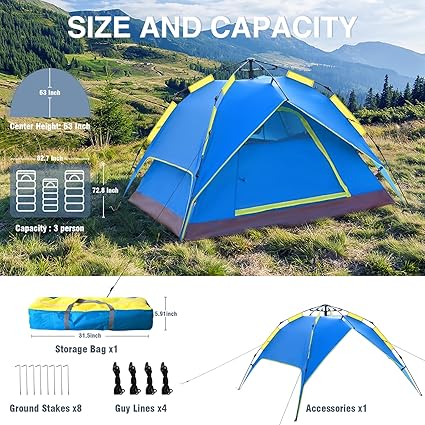 - AUTOMATIC CAMPING TENT WITH REMOVABLE OUTER: The versatile double-layer instant camping tent provides ample space for 3 people to move around,The instant tent unfolds to 82.67×72.83×63 inches.comprising detachable outer and inner layers,serves multiple functions.When combined,it functions as a reliable camping tent,providing protection against wind and rain.Additionally,the external tent can be used independently as a sun shelter,rainfly,pavilion,fishing awning,canopy,and more.