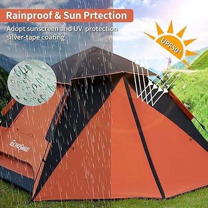 - Waterproof and UV Protection: The EchoSmile easy setup tent features 190T PU polyester fabric and 2000mm PU coating, effectively preventing water from seeping into the tent. With UPF 50+ sun protection and durable fiberglass poles, it’s perfect for adventurous trips.