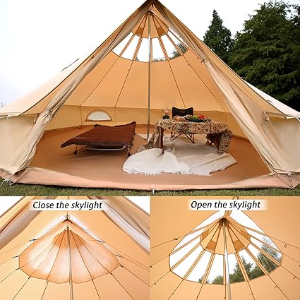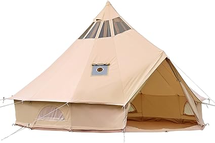- 4 Breathable Mesh Windows: The canvas bell tent has 2 layered doors, and 4 mesh windows, which allow the breeze to come in and keep the critters out, and the doors offer great views and ventilation. The canvas cover can be rolled up to provide 360-degree visibility and wind, The canvas windows and doors come with heavy-duty trouble-free top-grade zippers, smooth and reliable.