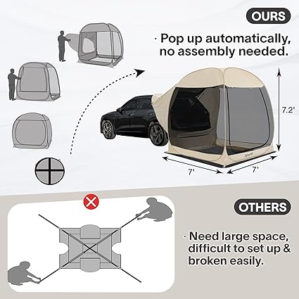 - EASY POP UP & TAKE DOWN: Trunk tent suv car tent pop up automatically, set up and attached with vehicle in a second, much easier than the other assembly car tents in the market. It measures 7’x7’x7.2’H, large interior space fits 4 – 5 adults comfortably. The innovative folding technique allow you to easily fold down it into a carry bag, dia 51.2”, only 16.6 lbs, lightweight and portable.