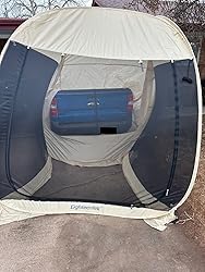 - INNOVATIVE STYLE: 3 mesh wall panels provide excellent air flow and amazing outdoor views. Connecting to the cargo area of vehicle, the bottom fabric of door wraps the car bumper. And the adjustable vehicle sleeve can be fixed with the van attached by magnets easily and closeness, so that you are protected from mosquitoes & insects. One large entrance door with double side zippers, easy to zip from inside and outside alike.
